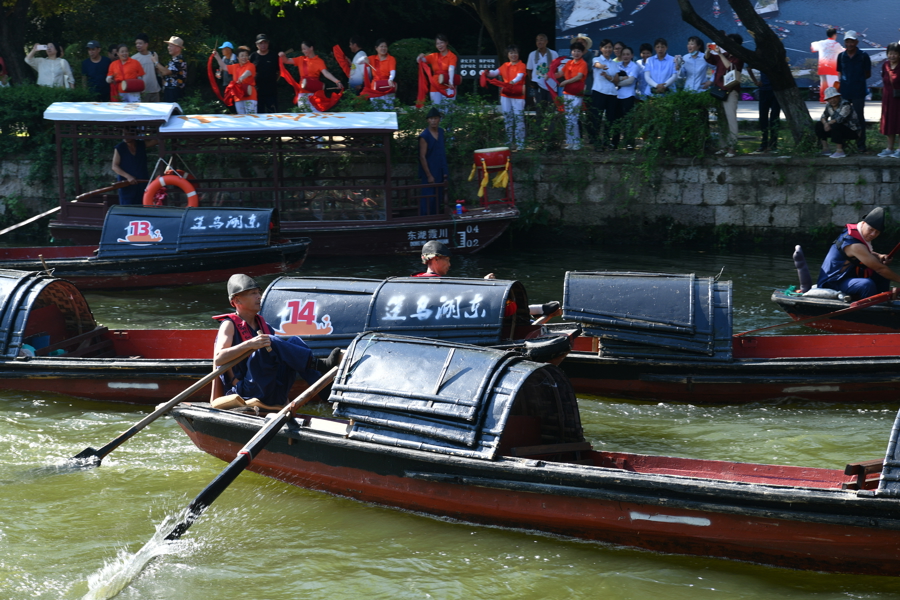 上午9时,伴随着雄壮的鼓点声,东湖景区新、老两位船工引领参赛队伍整齐划向东湖揽月桥起点,象征着乌篷船非遗技艺后继有人、薪火相传。随着鸣笛声响起,比赛正式开始!